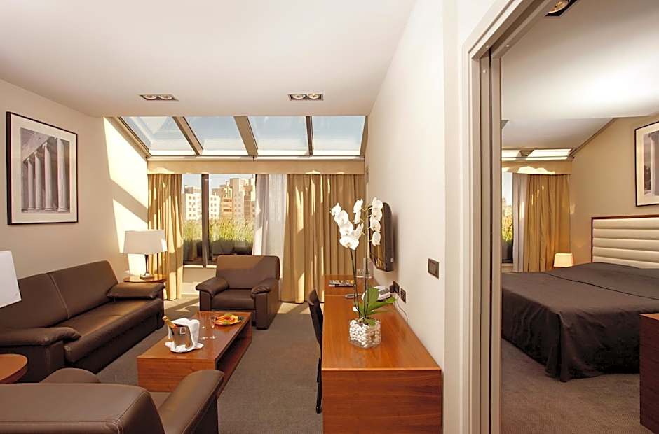 Top-floor suite with terrace. Includes Terry bathrobe & slippers, cotton satin linen, luxurious cosmetics.